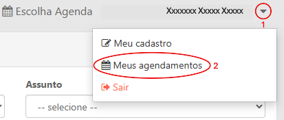 Caso você precise cancelar o agendamento, faça o login na plataforma da Agenda de Serviços, clique na seta localizada ao lado do seu nome, após em Meus agendamentos.