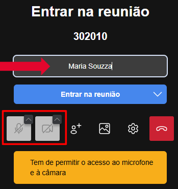 Informe seu nome e o último sobrenome. Habilite o acesso do microfone e câmera.