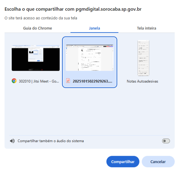 Iniciar partilha do ecrã: O compartilhamento de tela poderá ser utilizado caso você precise mostrar algum documento (o arquivo deverá estar aberto no seu equipamento). Ao clicar sobre o ícone, abrirá a imagem abaixo; selecione o documento na Guia do Navegador, Janela ou Tela Inteira e clique em compartilhar.